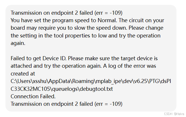 Transmission on endpoint 2 failed (err = -109) You have set the program speed to Normal. The circuit on your board may require you to slow the speed down. Please change the setting in the tool properties to low and try the operation again. Failed to get Device ID. Please make sure the target device is attached and try the operation again. A log of the error was created at D:\Desktop\ee\exer1.X\queuelogs\debugtool.txt Connection Failed. Transmission on endpoint 2 failed (err = -109)