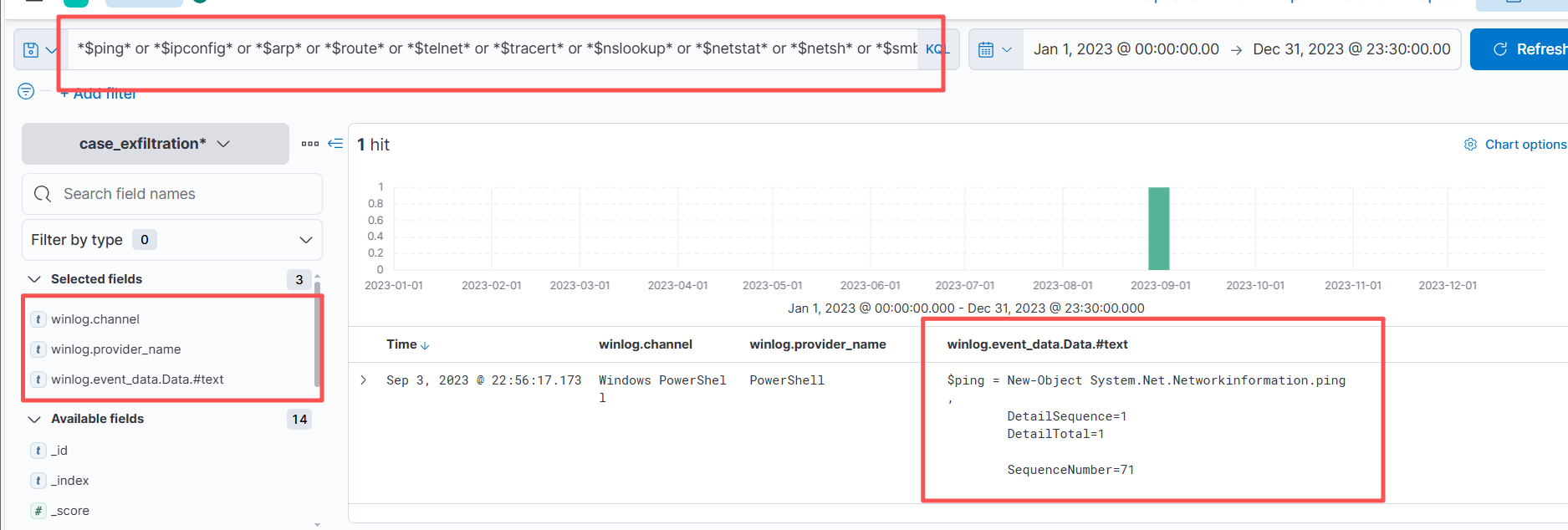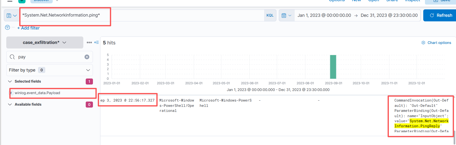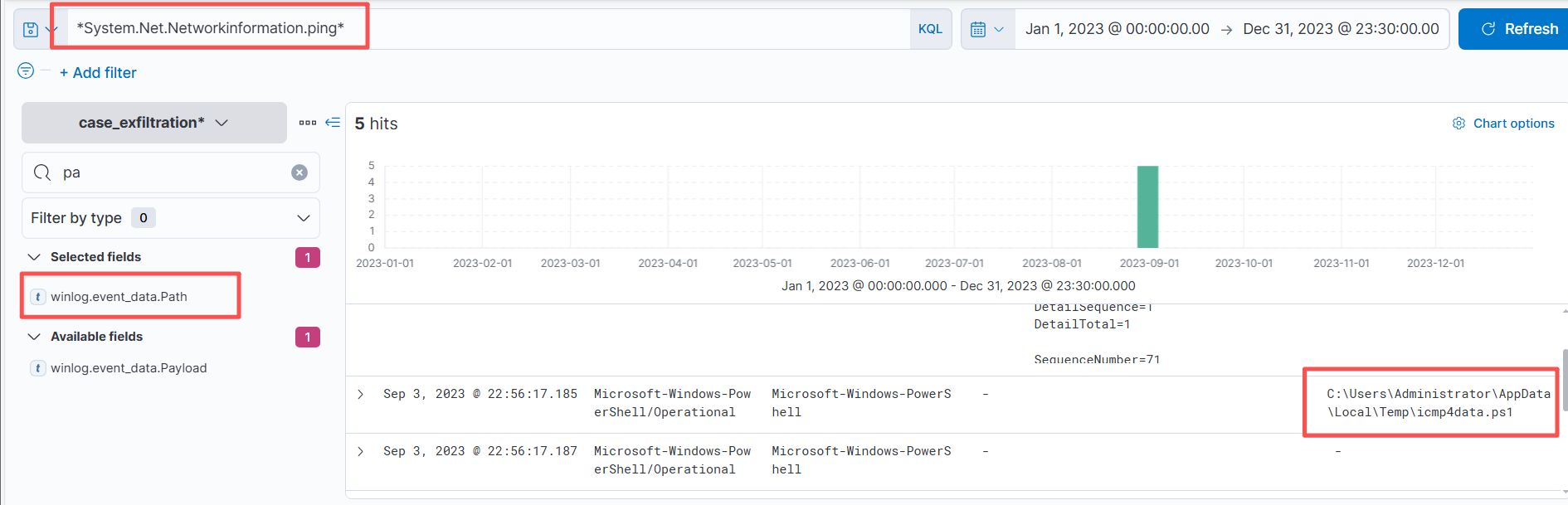 通过搜索只有一个数据包且说明了powershell创建了一个System.Net.NetworkInformation.Ping对象来传输ICMP包。其余什么信息都没有了。因此需要调查一下这个对象。过滤字段:winlog.event_data.Path(执行路径),winlog.event_data.ScriptBlockText(执行的操作),winlog.event_data.Payload(攻击Payload)