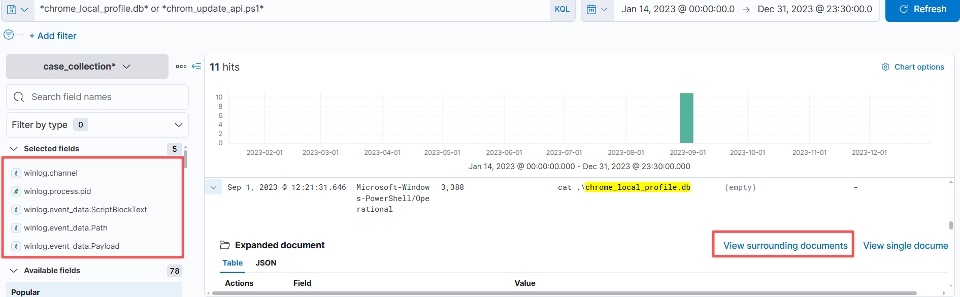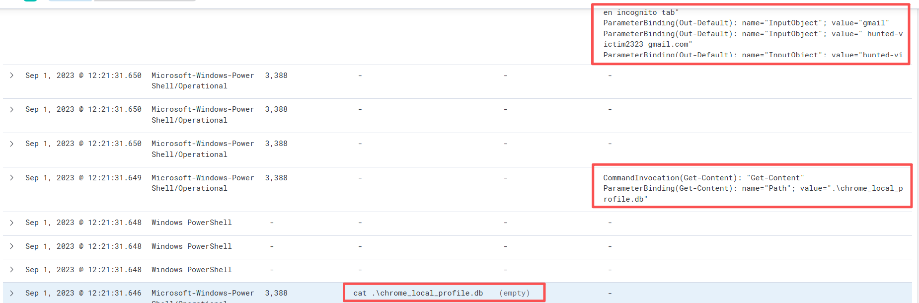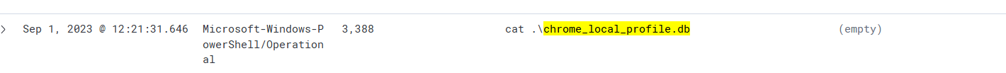 可以发现有4个包进行了键盘记录操作,因此就要判断是否为恶意操作。首先可以通过ScriptBlockText可以知道用户输入的信息会储存到\temp\chrome_local_profile.db中,这一看就是可疑的,但还需要进一步确认。其次还可以知道chrome_update_api.ps1调用了db文件。
