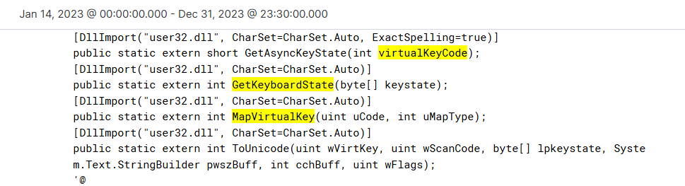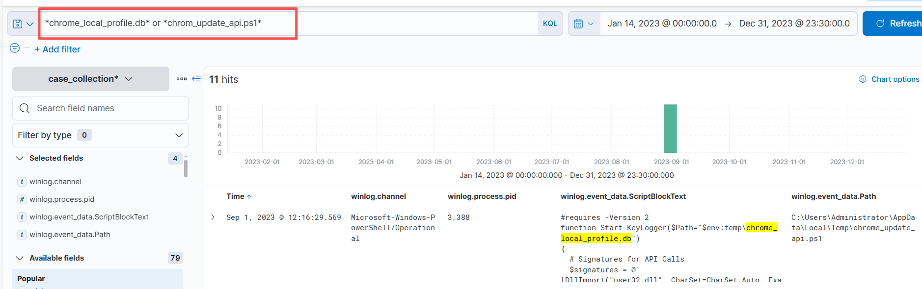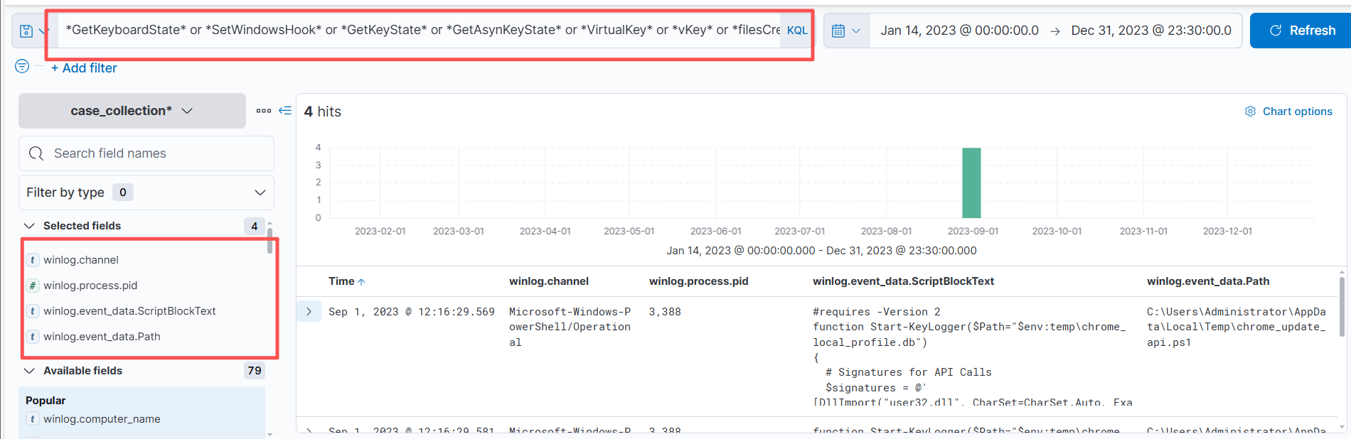 先查询是否存在窃取键盘信息的操作,需要过滤的字段winlog.chnnel(用户名),winlog.process.pid(进程号),winlog.vent_data.ScriptBlockText(是否进行窃取操作),winlog.event_data.Path(具体路径)。