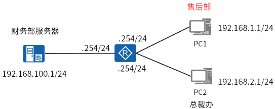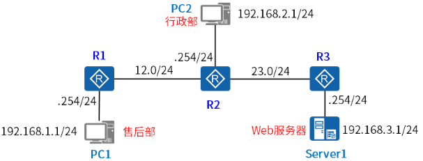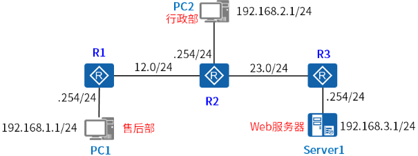 [R2]ip route-static 192.168.1.0 255.255.255.0 192.168.12.1 //去往售后部的网段