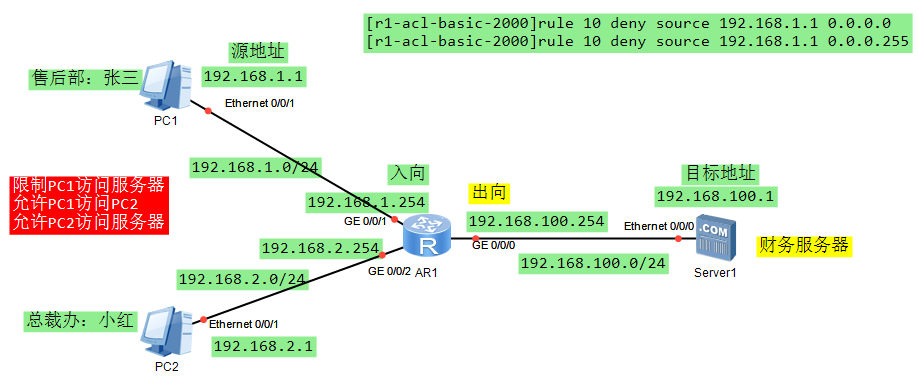 - 企业需求:禁止PC1访问财务服务器,允许PC2访问