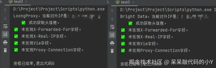 import requests; proxy = {"http": "自己的代理IP"}; test_urls = {"IP检查": "https://httpbin.org/ip", "请求头检查": "https://httpbin.org/headers"}; try: response_ip = requests.get(test_urls["IP检查"], proxies=proxy, timeout=10); print(f"smartproxy,当前对外IP是: {response_ip.json()['origin']}"); response_headers = requests.get(test_urls["请求头检查"], proxies=proxy, timeout=10); headers = response_headers.json()['headers']; print(f" ✅ 成功获取头信息。"); print("✅ 未发现X-Forwarded-For字段。") if 'X-Forwarded-For' not in headers else print(f"⚠️ 警告:发现X-Forwarded-For字段,内容为: {headers['X-Forwarded-For']}"); print("✅ 未发现X-Real-IP字段。") if 'X-Real-IP' not in headers else print(f"⚠️ 警告:发现X-Real-IP字段,内容为: {headers['X-Real-IP']}"); print("✅ 未发现Via字段。") if 'Via' not in headers else print(f"⚠️ 警告:发现Via字段,内容为: {headers['Via']}"); print("✅ 未发现Proxy-Connection字段。") if 'Proxy-Connection' not in headers else print(f"⚠️ 警告:发现Proxy-Connection字段,内容为: {headers['Proxy-Connection']}"); except Exception as e: print(f"请求出错: {e}")