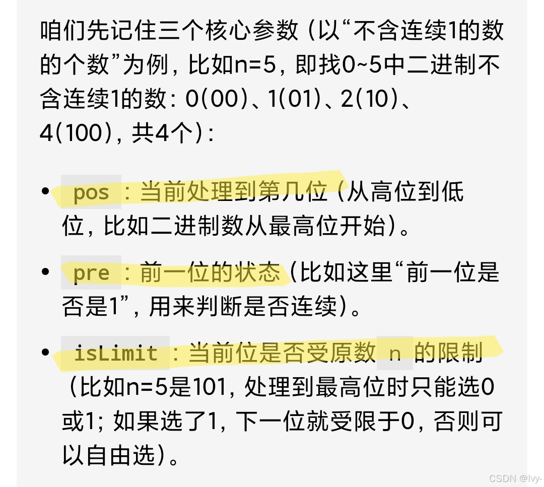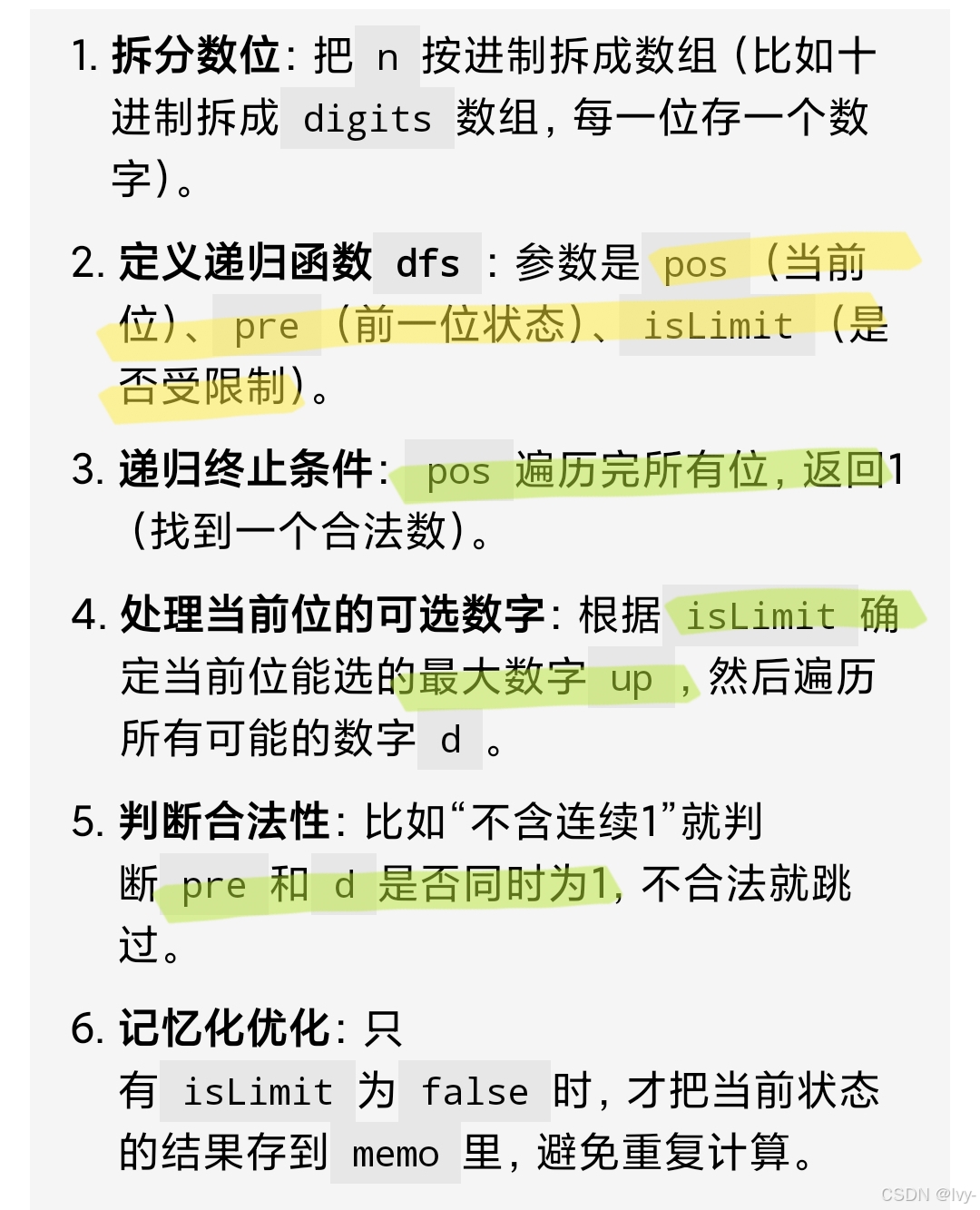 - 条件变了:比如"数位和是偶数",就把 pre 改成"前几位的数位和的奇偶性",然后判断最终和是否为偶。
