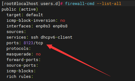 [root@localhost users.d]# firewall-cmd --add-port=8123/tcp --permanent