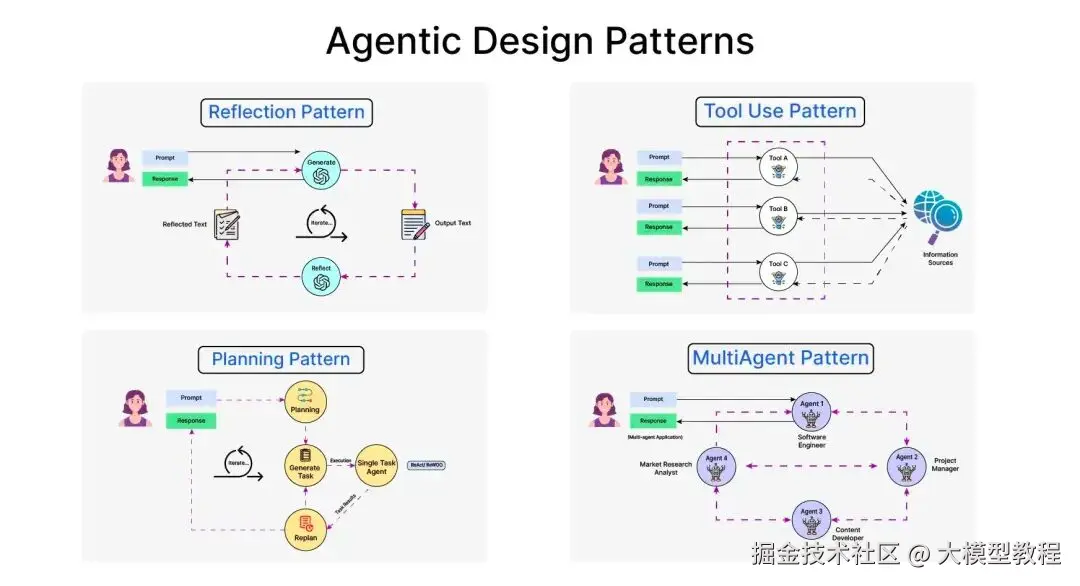 - 思考-行动模式(ReAct) :适合即时响应任务,通过边推理边调用工具逐步逼近目标;