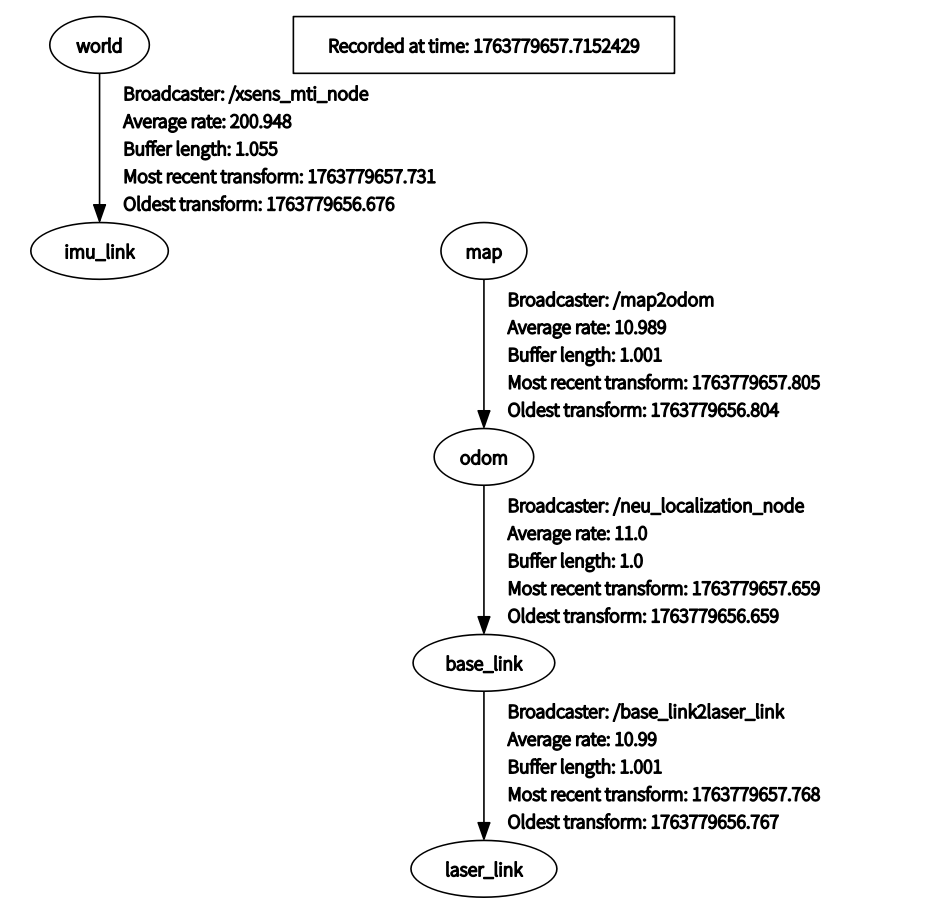 <node pkg="tf" type="static_transform_publisher" name="base_link2laser_link" args="0.0 0.0 0.0 0 0 0 1 base_link laser_link 100" />