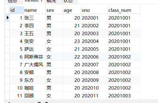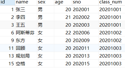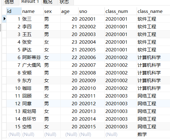 查询出20201001班的男同学 和-->and 或-->or