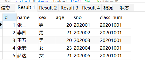 select * from studnet limit 5 offset 0;#第一页