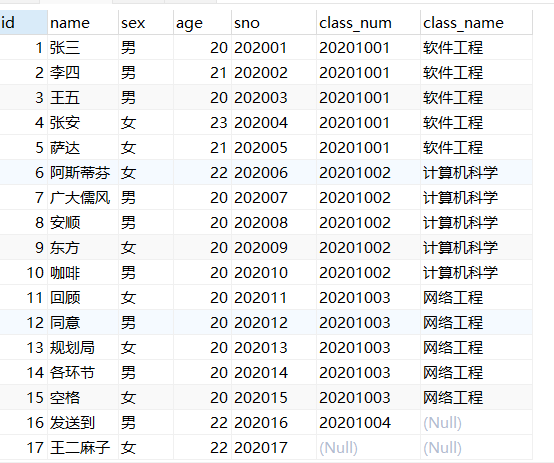 select s.*,c.class_name from student s left join class c on s.class_num=c.class_num;