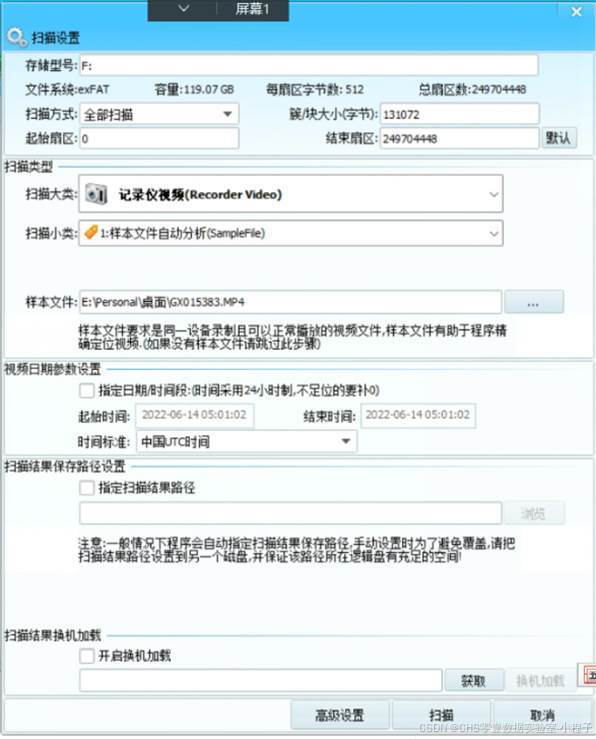 大疆的手持云台在扫描时一定要选择exFat逻辑盘+添加样本文件(mp4),这两点对于恢复效果极其重要!!!样本文件一定一定要选择MP4文件,不要选择LRV!!!