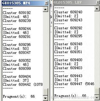 Gopro之前也说过很多次,其在采集画面时一般是生成三个文件,THM、LRV、MP4,其中THM是第一帧的静态画面,另外两个一个是预览的分辨率较低小视频LRV(用于在GORPO小屏上播放),一个是分辨率较高的视频MP4。这两个文件是交叉排队写入,所以存在大量碎片(图1)。这个是通用类恢复软件恢复后无法播放的主因,因为格式化或者删除后FAT表清0,文件链表不存在,所以只能通过起始簇和文件大小进行恢复,这也就导致了恢复错误。