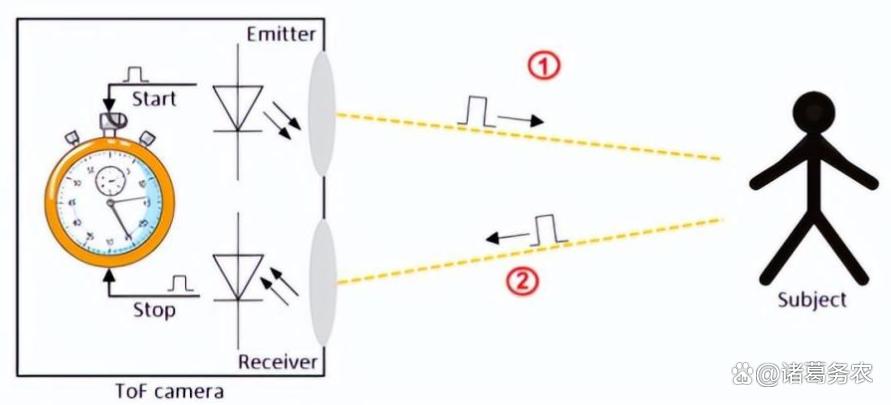 ToF(Time-of-Flight,飞行时间)相机的核心原理是:通过向目标物体发射光脉冲(通常是不可见的红外光),并测量光脉冲从发射到经物体反射后返回传感器所需的时间(或相位差),利用光速恒定这一特性,直接计算出物体与相机之间的距离。