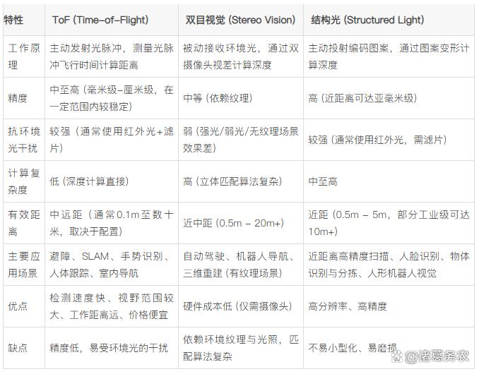 ToF + 可见光相机:ToF提供深度信息,可见光相机提供丰富的纹理和颜色信息,两者融合可实现更鲁棒和语义丰富的环境感知。