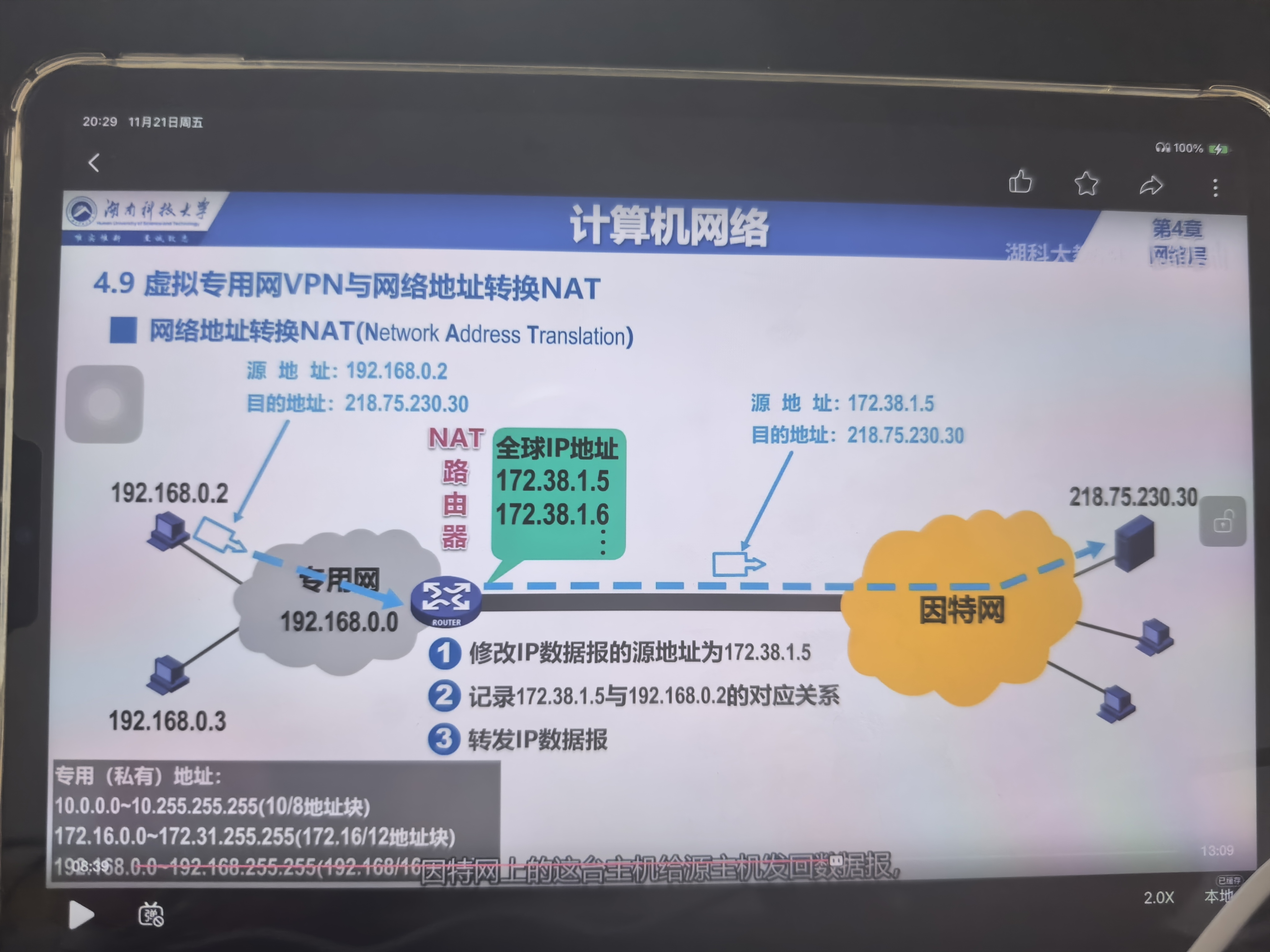 他会在私有地址经过路由的时候把私有地址转化为公用的ip(伪装吧),进入专用网之后,它就会转换回来。