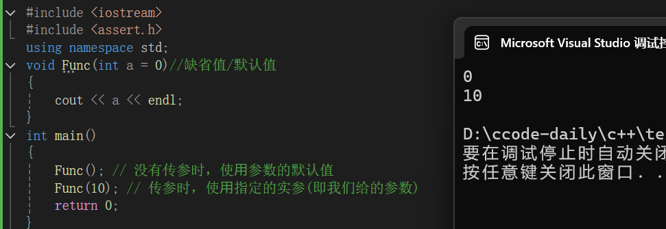 Func(10); // 传参时,使⽤指定的实参(即我们给的参数)