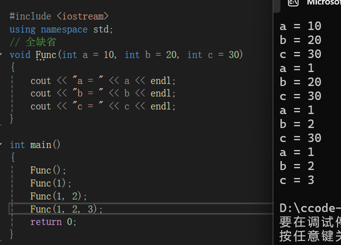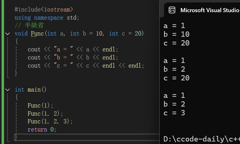 这里我们依旧根据规则,C++ 规定半缺省参数必须从右往左依次连续缺省,不能间隔跳跃给缺省值,这里需要注意我们需要进行传参不能像全缺省一样不传参数:当我们传入1时,从左向右依次赋值,所以a是1,其他还是使用缺省值;当我们传入1和2时,从左向右依次赋值,所以a是1,b是2,c依旧使用缺省值;当我们传入1,2,3时,从左向右依次赋值,所以a是1,b是2,c是3.