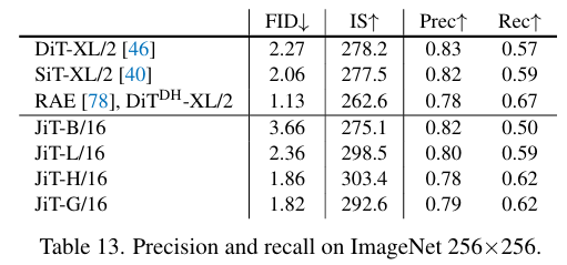 为完整起见,我们在表13中报告ImageNet 256×256上的精确度和召回率[32],与常用的DiT和SiT基线以及最新的RAE进行比较: