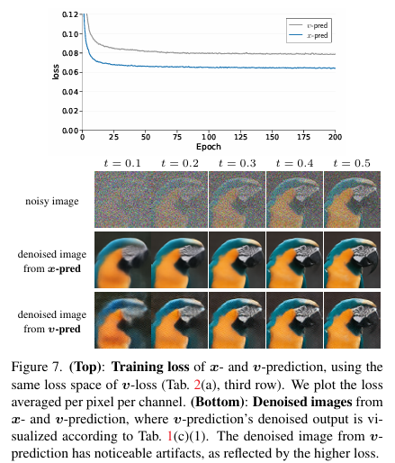 在图7(顶部),我们在相同的v-损失下比较训练损失曲线,定义为L=E∥vθ(zt,t)−v∥2\mathcal{L}=\mathbb{E}\|\pmb{v}{\theta}(\pmb{z}{t},t)\pmb{-v}\|^{2}L=E∥vθ(zt,t)−v∥2,使用v-预测(i.e., vθ=netθ)(i.e.,\,v_{\theta}={\tt n e t}{\theta})(i.e.,vθ=netθ)与x-预测(即,vθ=\boldsymbol{v}{\boldsymbol{\theta}}=vθ= (netθ − zt)/(1 − t))(\mathtt{n e t}{\theta}\!-\!z{t})/(1\!-\!t))(netθ−zt)/(1−t))。由于损失在同一空间中计算,且只有参数化不同,比较损失值是合法的。