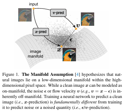 当扩散生成模型首次被开发时[57,59,23],其核心思想本应是去噪,即从其损坏版本中预测干净图像。然而,扩散模型演进中的两个重要里程碑最终偏离了直接预测干净图像的目标。首先,预测噪声本身(称为"ε-预测"[23])在生成质量上产生了关键性差异,并在很大程度上普及了这些模型。后来,扩散模型通过预测流速度("v-预测"[52])与基于流的方法[37,38,1]联系起来,流速度是一种结合了干净数据和噪声的量。如今,实际应用中的扩散模型通常预测噪声或含噪量(例如,速度)。