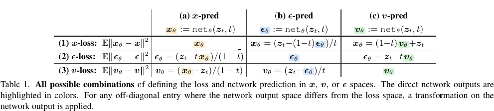 综合起来,考虑在{x,ϵ,v}\{\boldsymbol{x},\boldsymbol{\epsilon},\boldsymbol{v}\}{x,ϵ,v}中定义的三个未加权损失,以及三种形式的网络直接输出,有九种可能的组合(表1)。每种组合构成一个有效的公式,九种情况中没有两种在数学上等价。