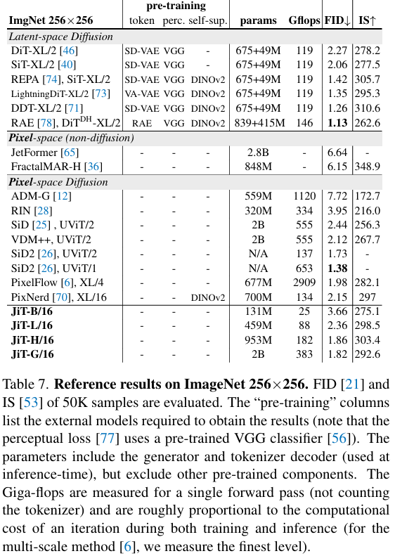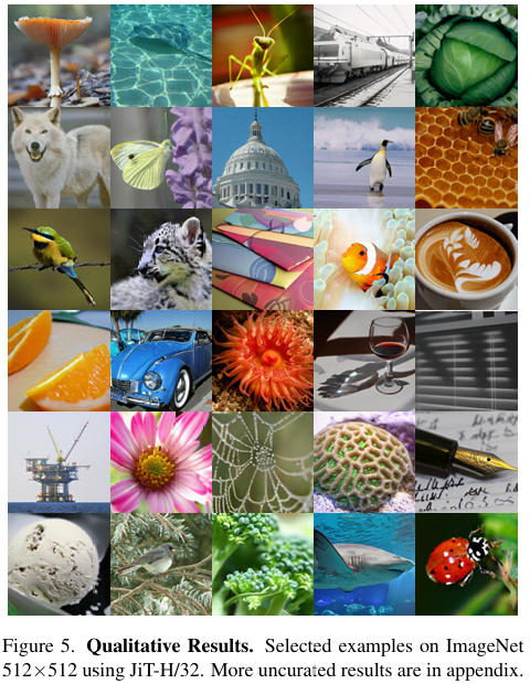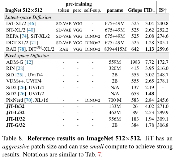 有趣的是,随着模型变大,256和512分辨率之间的FID差异变小。对于JiT-G,在512分辨率下的FID甚至更低。对于ImageNet上非常大的模型,FID性能在很大程度上取决于过拟合,而在512分辨率下进行去噪是一项更具挑战性的任务,使其不易过拟合。