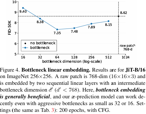 图4绘制了FID与瓶颈维度d′d'd′的关系,使用JiT-B/16(每原始图像块768-dim)。即使将瓶颈维度减少到16-d这样小的值,也不会导致灾难性失败。事实上,跨广泛范围(32到512)的瓶颈维度可以提高质量,幅度相当大,最高可达~1.3 FID。
