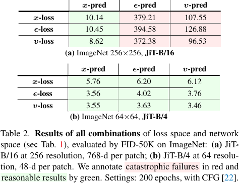 作为比较,我们在64×64分辨率下检查JiT-B/4(表2(b))。在这里,所有情况都表现相当好:九种组合之间的准确度差距很小,不是决定性的。每个图像块的维度是48(4×4×3),远低于JiT-B中768的隐藏大小,这解释了为什么所有组合都能合理工作。我们注意到,许多先前的潜在扩散模型具有类似的低输入维度,因此没有暴露于我们在此讨论的问题。