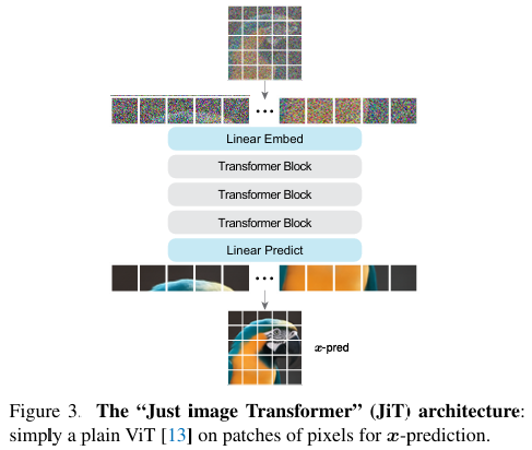 在本文中,我们回归基本原理,让神经网络直接预测干净图像。通过这样做,我们证明了在由原始像素组成的大图像块上运行的普通Vision Transformer(ViT)[13]可以有效地用于扩散建模。我们的方法是自包含的,不依赖于任何预训练或辅助损失------没有潜在分词器[49]、没有对抗损失[16,49]、没有感知损失[77,49](因此没有预训练分类器[56]),也没有表示对齐[74](因此没有自监督预训练[45])。从概念上讲,我们的模型不过是应用于扩散的"纯图像Transformer",我们称之为JiT。