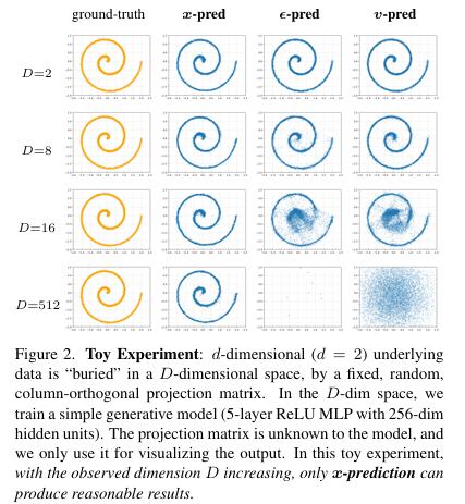 根据流形假设[4],数据x倾向于位于低维流形上(图1),而噪声ε和速度v则不在流形上。让网络直接预测干净数据x应该更易处理。我们在本节的玩具实验中验证这一假设。