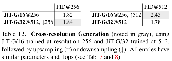 在一个分辨率上训练的模型可以通过简单地下采样或上采样生成的图像应用到另一个分辨率。我们称之为跨分辨率生成。在我们的设置中,256分辨率下的JiT/16和512分辨率下的JiT/32具有可比的参数和计算量,使它们的跨分辨率比较有意义。结果在表12中。