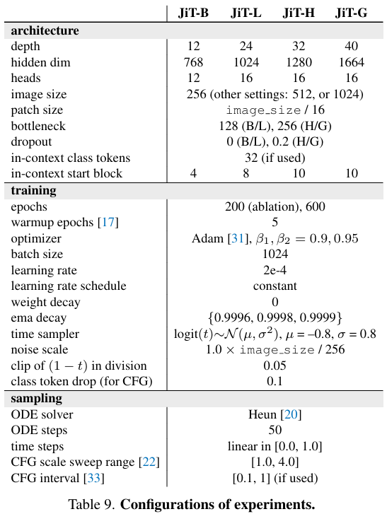 对于ImageNet 1024 × 10241024\!\times\!10241024×1024,我们使用模型JiT/64并将噪声ε按4×缩放。不需要其他更改。
