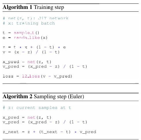 算法1显示了训练步骤的伪代码,算法2显示了采样步骤(欧拉求解器;可以扩展到Heun或其他求解器)。为简洁起见,省略了类别条件和CFG[22],但两者遵循标准实践。为防止1/(1−t)1/(1{-}t)1/(1−t)中的零除,我们剪裁其分母(默认情况下,0.05),无论何时计算此除法。