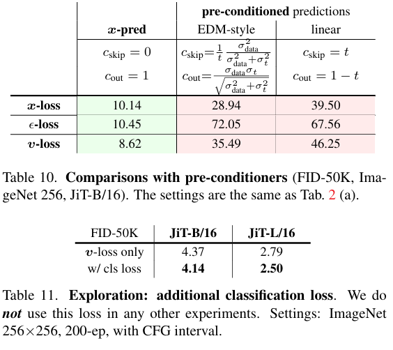 然而,表2(a)在ImageNet 256×256上表明,损失加权不是全部。一方面,在表2(a)中,无论损失空间如何,ε-和v-预测都会灾难性失败,这对应于不同损失空间中的不同有效加权(如所讨论的)。另一方面,x-预测在所有三种损失空间中都有效:由v-损失引起的损失加权是可取的,但不是关键的。