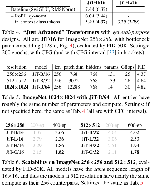 在下一节的表5和表6中,我们展示了在512分辨率下使用JiT/32和在1024分辨率下使用JiT/64的结果,使用成比例的大图像块大小p=32p{=}32p=32或p=64p{=}64p=64。这相当于每个图像块3072维(即,32×32×332{\times}32{\times}332×32×3)或12288维,远大于B、L和H模型的隐藏大小(在[13]中定义)。尽管如此,x-预测工作得很好;事实上,除了按比例缩放噪声外,它无需任何修改就能工作KaTeX parse error: Undefined control sequence: \ensuremath at position 7: (e.g.,\̲e̲n̲s̲u̲r̲e̲m̲a̲t̲h̲{\mathsf{b y}}\...和4×4\times4×在分辨率512和1024;见附录)。