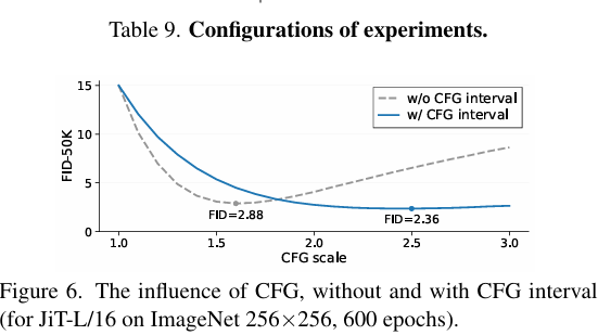 我们的CFG比例候选范围从1.0到4.0,步长为0.1。CFG的影响在图6中显示,适用于JiT-L/16模型。我们的EMA衰减候选为0.9996、0.9998和0.9999,使用1024的批量大小进行评估。对于每个模型(包括消融中的任何模型),我们使用8K样本搜索最佳设置,然后应用它来评估50K样本。