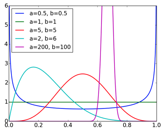 下图展示了不同参数 a a a和 b b b值下的贝塔分布曲线。