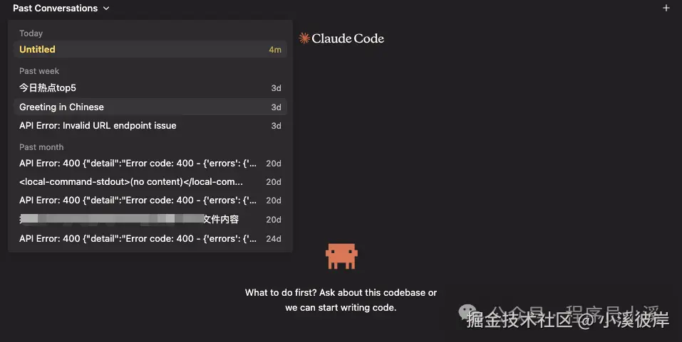 点击【New conversation】会新开一个Claude Code页签开始一个新会话,点击【Resume conversation】会展开历史会话
