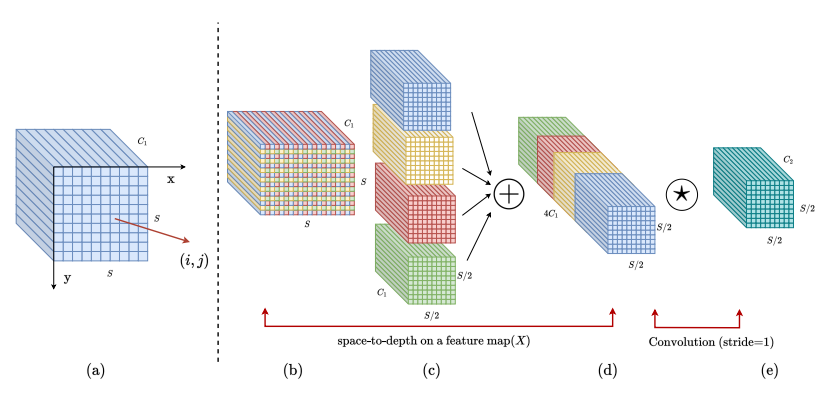 空间到深度转换:通过空间到深度操作,将像素的空间块重新排列到深度/通道维度,增加通道数到 4 C ,同时将空间维度缩小2倍