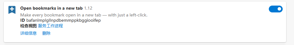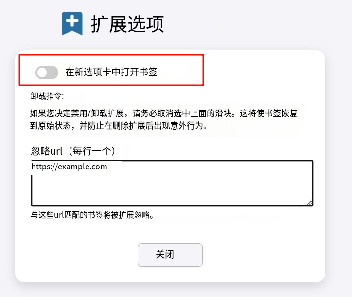 特殊说明:不再使用该扩展时,记得进入扩展设置中,先把这个选项取消勾选,再卸载(否则会影响所有书签页正常打开)(忘记了关闭开关,删除扩展后,再下载回来重新关闭也是可以的。影响主要是所有的书签被改为带该插件URL了,影响收藏夹里书签地址,不影响打开)(我这里跟我的沉浸式翻译打开本地文档冲突了,所以我每次使用沉浸式翻译会把开关关闭,要用时再开开,还是比较方便的。)(暂时发现的问题是不关这个开关,无法在浏览器打开本地文件夹的索引)