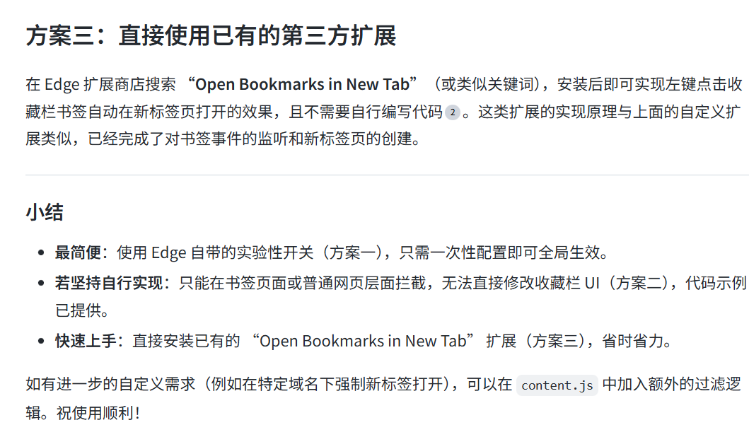 4.帮我写个EDGE插件,在不修改收藏栏原链接的前提下,让edge浏览器总在新建标签页打开收藏网址。(实现了,但是点一次书签会同时打开两个)