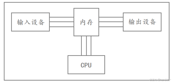 虽然这里的 输入设备、输出设备、内存、CPU 都在一台机器上,但这几个硬件设备是彼此独立的。如果它们之间要进行数据交互,就必须要想办法进行通信,因此这几个设备实际是用"线"连接起来的,其中连接内存和外设之间的"线"叫做 I/O 总线,而连接内存和 CPU 之间的"线"叫做系统总线。由于这几个硬件设备都是在一台机器上的,因此这里传输数据的"线"是很短的,传输数据时出现错误的概率也非常低