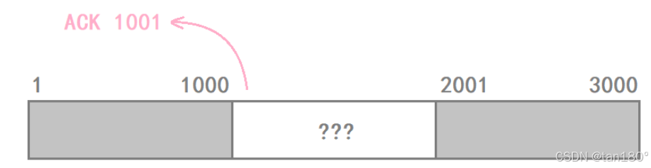 如果这三个报文在网络传输过程中出现了丢包,最终只有序号为 1和2001 的报文被 主机B 收到了,那么当 主机B 在对报文进行顺序重排的时候,就会发现只收到了 1-1000 和 2001-3000 的字节数据。此时 主机B 在对 主机A 进行响应时,其响应报头当中的 32位确认序号 填的就是 1001 ,告诉 主机A 下次向我发送数据时应该从 序列号 为 1001 的字节数据开始进行发送