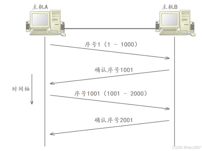 还是以刚才的例子为例, 主机A 发送了三个报文给 主机B ,其中每个报文的有效载荷都是1000字节,这三个报文的32位序号分别是1、1001、2001。