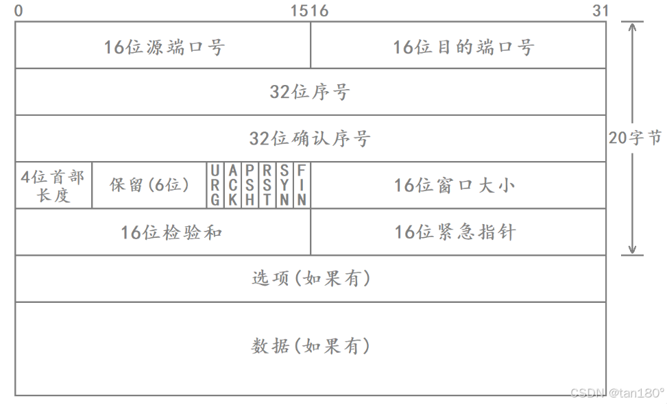 - 4位TCP报头长度:表示该TCP报头的长度,以4字节为单位