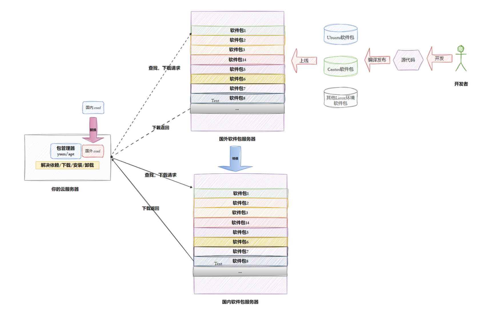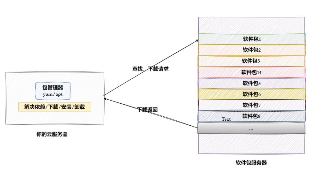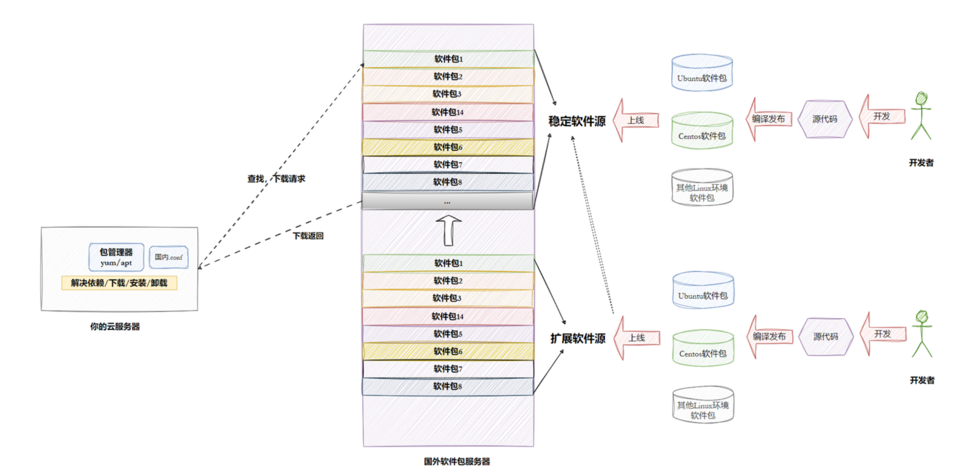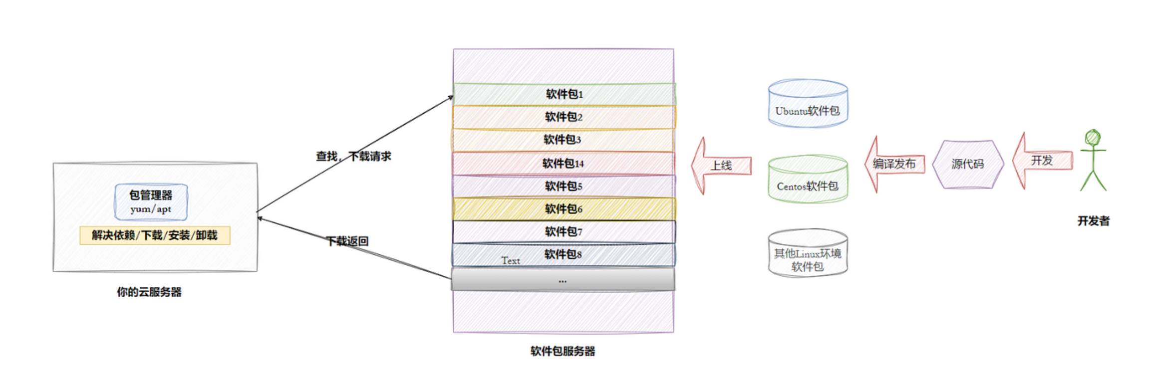 • 但是这样太麻烦了,于是有些人把一些常用的软件提前编译好,做成软件包(可以理解成windows上的安装程序)放在一个服务器上,通过包管理器可以很方便的获取到这个编译好的软件包,直接进行安装。