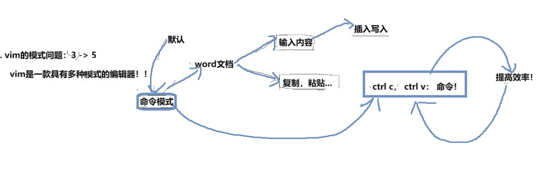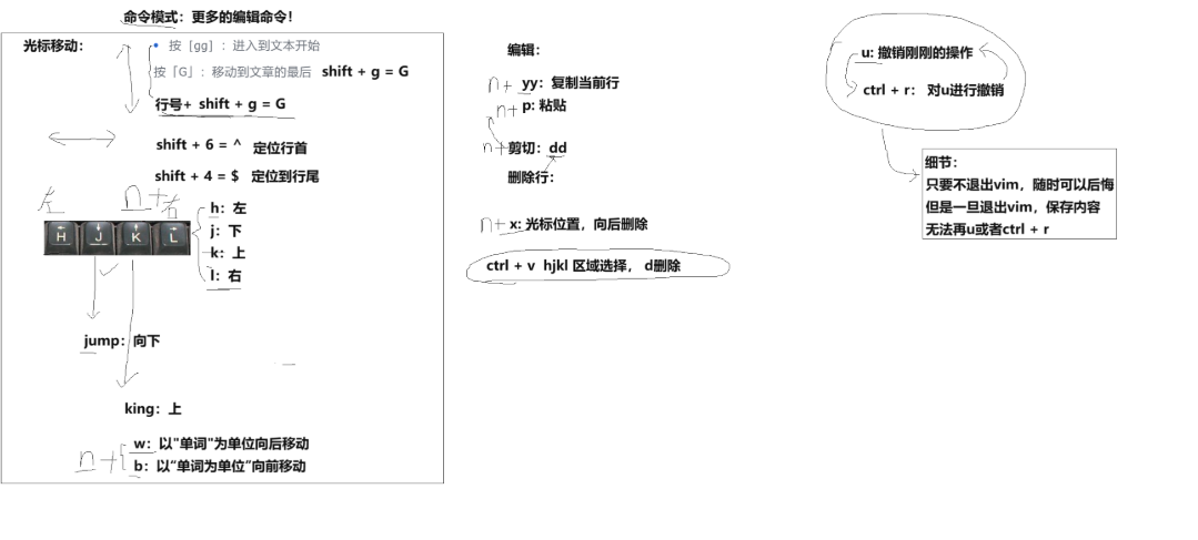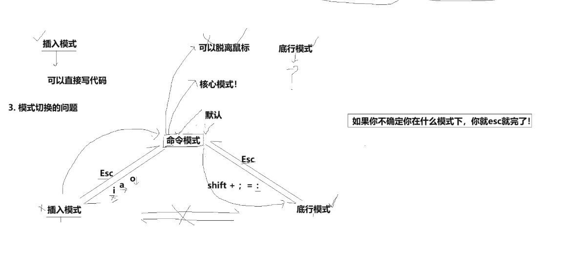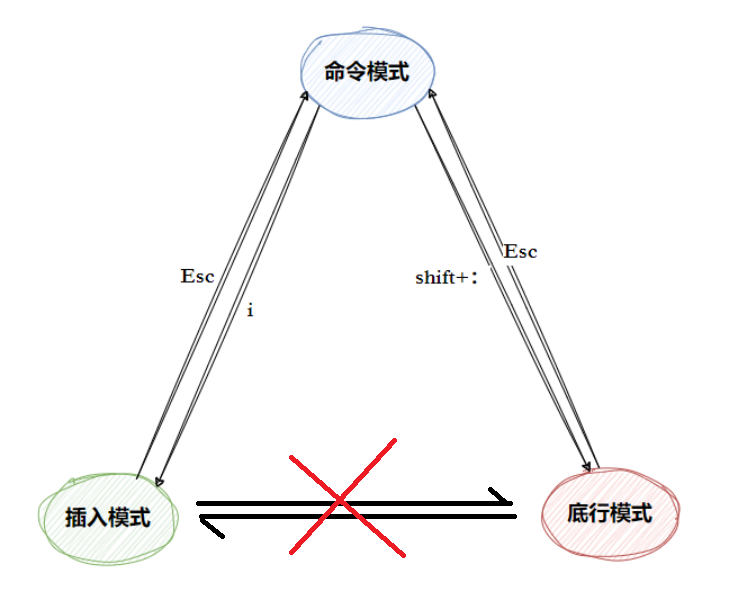 课堂上我们讲解vim的三种模式(其实有好多模式,目前掌握这3种即可),分别是命令模式 (command mode)、插入模式 (Insert mode)和底行模式(last line mode),各模式的功能区分如下: