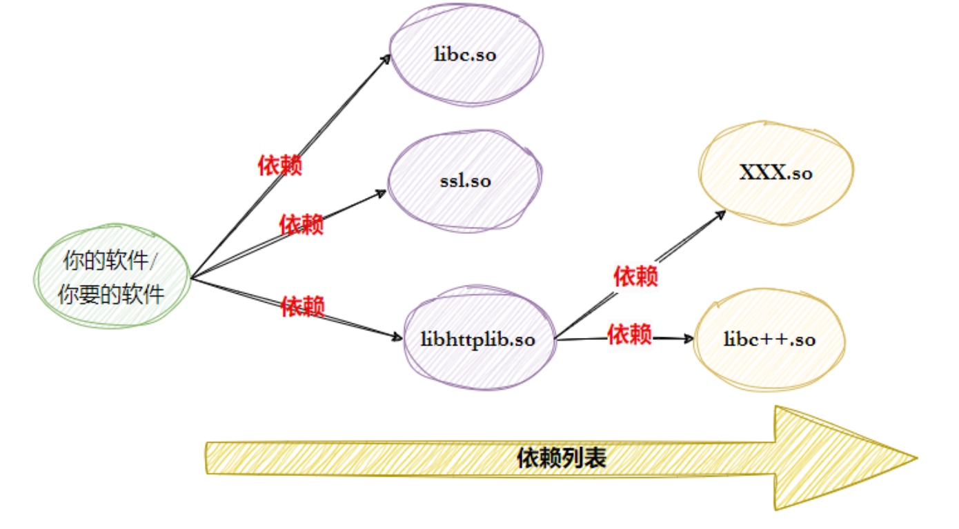 例如:下载的软件可能会依赖c语言标准库,加密解密对应的库,网络对应的库。而网络对应的库还会依赖c++的库和其他的库(如下图所示)