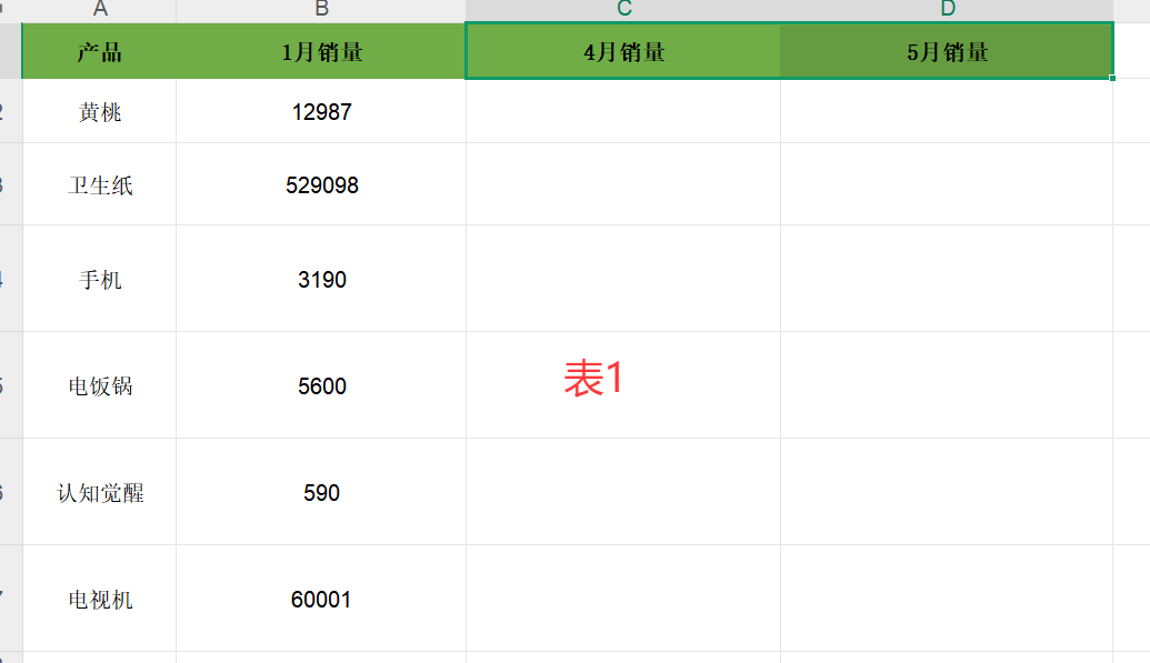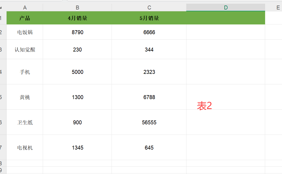 5月份销量合并, 选中表1的D2(5月份销量)位置,然后输入下面函数: