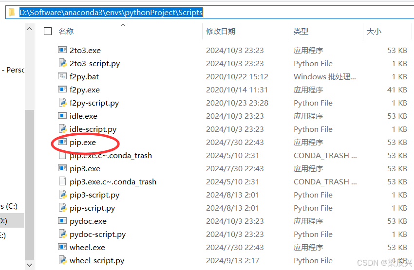 1,找到虚拟环境下pip存放的路径:D:\Software\anaconda3\envs\pythonProject\Scripts。